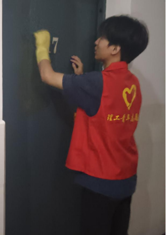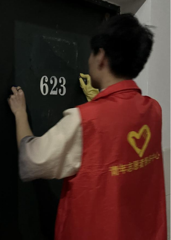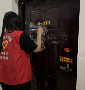 经过志愿者们几小时的辛勤劳动,原本满是胶带残留物的宿舍门变得干净整洁,墙面也恢复了原本的光洁亮丽。整个宿舍门口焕发出新的生机与活力,让人眼前一亮。