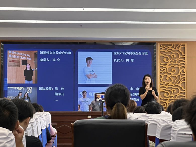 冯宇老师随后介绍了校企合作班及“创意101”实践项目,强调该项目旨在推动产学研结合,帮助学生提前积累行业经验。提问环节中,新生踊跃发言,就专业学习、就业方向等提出问题,教师团队一一耐心解答,现场互动热烈。