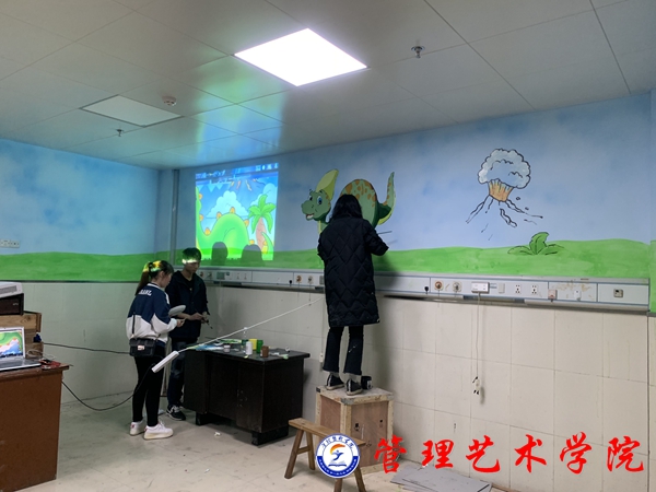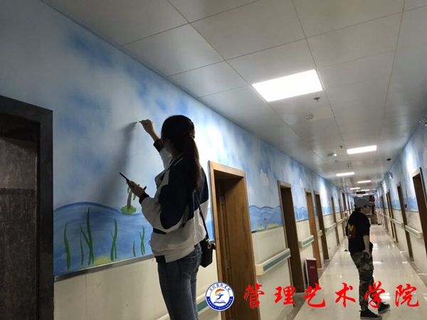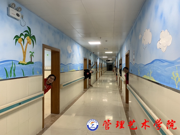 管理艺术学院动漫设计专业负责人廖慧娟老师说:“众所周知在我们的认知里,色彩包含有冷暖感、有距离感、有大小感、有重量感。因而在医院儿科这类特殊的室内设计中,如果合理的运用色彩,来改善医疗就医环境,会对孩子们的心理产生积极影响。本次墙绘作品的设计理念是:健康、希望、活力。以蓝色,绿色为主,都是很好的减压色彩。用简单的材料打造丰富的视觉图景,给儿童以精神安慰,弄脏的是的我们的双手,美化的是小朋友的心灵。身为艺术专业教师,教授学生专业知识,更应该参加社会活动,此类活动是一种锻炼,一方面增强了学生的社会责任感、奉献精神和公民意识;另一方面也开阔了学生视野,丰富了人生经验,锻炼和增强了他们参与社会事务和公共事务的能力,让学生在服务社会,实践过程中追逐自己的艺术的梦想,绽放大学生青春特有的光彩。”
