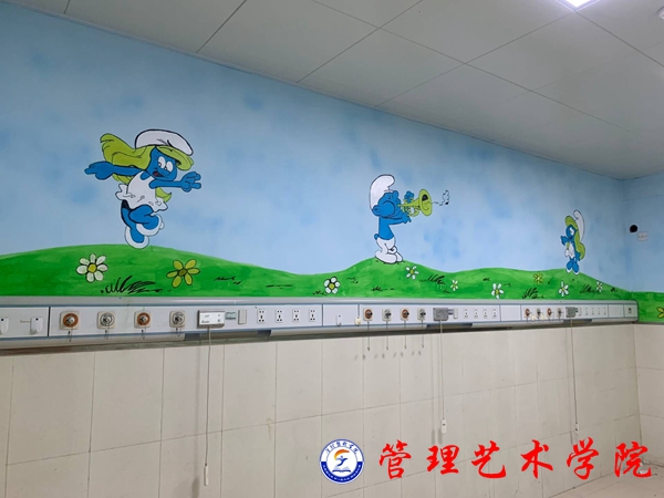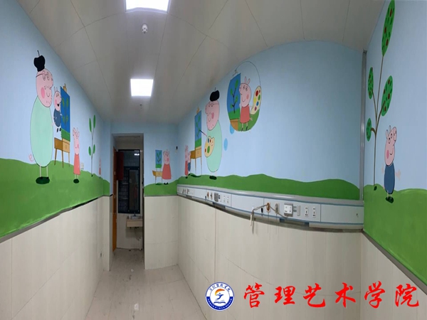 2019年4月,管理艺术学院艺术设计类专业童驿峣、向莉、张璋、胡鑫、张思维5名同学在廖慧娟、周艳芳老师的带领下,来到湘潭市三医院儿科住院部。经过师生三天的不懈努力,一幅幅漂亮的绘画跃然墙上,原本雪白冰冷的病房焕发出“生机”。