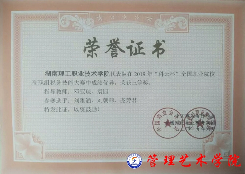 6月1日,在2019年“科云杯”全国职业院校高职组税务技能大赛中,我校管理艺术学院参赛队(选手会计1171班刘雅涵、会计1174班刘朝菲、会计1174班尧芳君;指导教师邓亚琼、袁园)在比赛中稳定发挥、团结协作,以扎实的专业知识和过硬的专业技能荣获大赛三等奖。