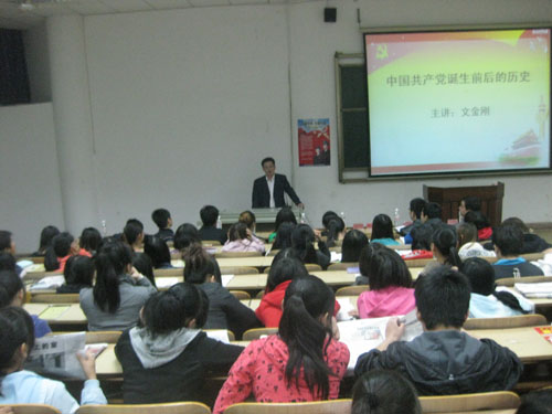 (黄永录)2011年10月25日19时30分,经贸社科系党建知识讲座在3教多媒体四教室隆重举行。本次讲座主题为中国共产党建党前后的历史,主讲人为湖南科技大学党史专业硕士研究生文金刚老师。系党总支副书记曾丹、学工一支部书记阮筱棋、学工二支部书记昌建强、团总支书记李强、辅导员黄永录老师以及全体学生党员、入党积极分子参加了此次讲座。
