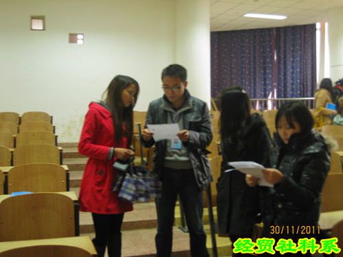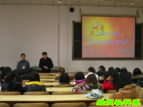 (黄永录)2011年11月30日下午13点40分,经贸社科系党员教师帮扶助就业座谈会在三教多媒体四如期举行。经贸系学工一支部书记阮筱棋、学工二支部书记昌建强、团总支书记李强、辅导员黄永录等出席,共36名帮扶学生参加此次座谈会。座谈会旨在进一步了解09级帮扶对象的就业情况,并进行简历制作的指导和简历收集以推荐就业。