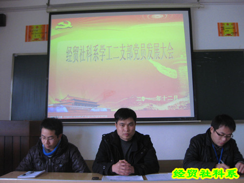 (黄永录)2011年12月29日中午13:00,经贸社科系学工二支部在在3-509教室举行预备党员发展暨预备党员转正支部大会。参加支部大会的有学工二支部全体党员,共27名,其中正式党员5名,以及此次发展对象 18人。大会由学工二支部书记昌建强主持。