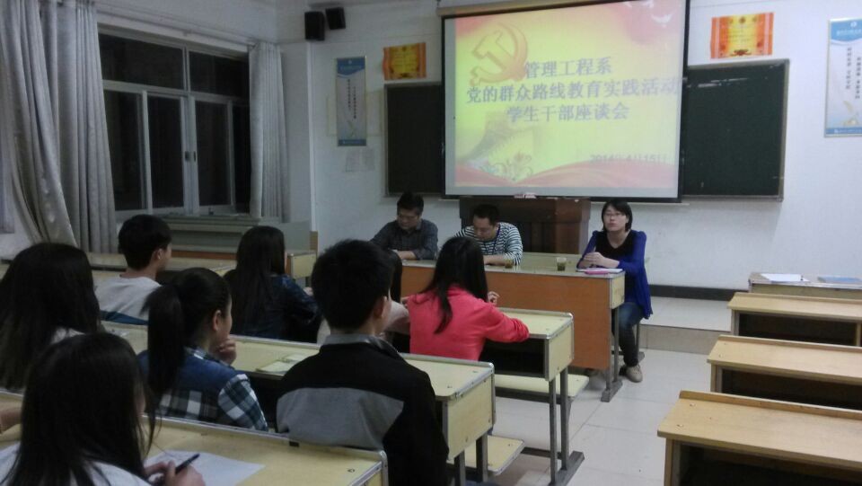 为加强我系教学管理培养优良学风和教风,2014年4月15日晚上在505教室开展大一、大二学生干部座谈会,参加人员有学工保卫处宋乃冰处长,管理工程系党总支副书记刘湘辉老师,管理工程系学管干事马云、辅导员毕业老师