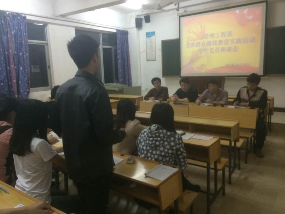 2014年4月15日晚上,全系学生党员在三教505开展了以听取学生对于党的群众路线教育实践活动的座谈会。学院副院长朱奇卫、组织人事处处长周金玉、系主任谭境佳、党支部二支部书记昌建强、教务干事雷霞及全体学生党员(13名)参加座谈会。会议由党支部二书记昌建强主持,由谭境佳主任和周金玉处长讲话。谭境佳主任对于学生党员提出要真正发挥党员模范先锋作用。周金玉处长提出“入党为什么,为党做什么”我们学生党员要深刻学习党的群众路线和方针。
