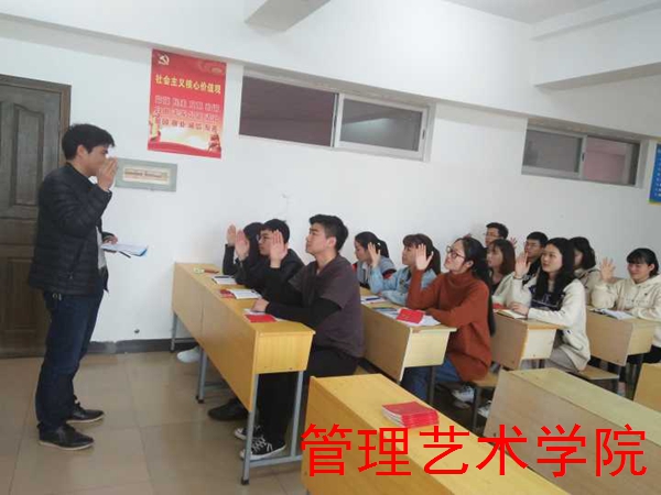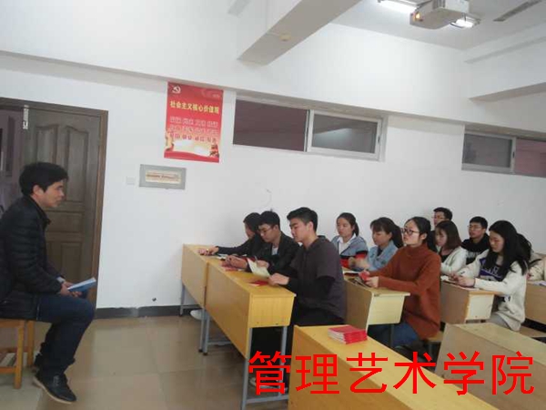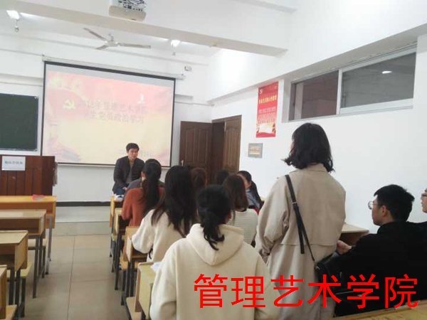 管理艺术学院在校“四个一流”目标要求下,推进“四个一”工程学习教育常态化,制度化建设,提高党员的理论水平与政治素质,树立学生党员的先锋模范作用。3月14日,学院学生党支部在明理楼608教室开展集中政治学习。