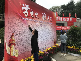 在庄严肃穆的湘潭烈士陵园纪念碑前,管理艺术学院学生第一、第二党支部党员和入党积极分子,在签名墙上签下自己的名字,表达对烈士的崇高敬意,签名后手捧菊花,整齐列队在烈士纪念碑前高唱国歌,国歌唱后向烈士纪念碑三鞠躬,在《献花曲》中全体人员怀着无比沉重的心情环绕烈士纪念碑一周,告慰烈士忠魂,寄托新时代青年学生对烈士的无限哀思。学生第一党支部书记姜维老师勉励学生党员和入党积极分子:“大家作为当代青年大学生党员和入党积极分子,应把自己的个人梦融入到中国梦中,努力学习专业知识,为实现中华民族的伟大复兴贡献自己的青春和力量”。