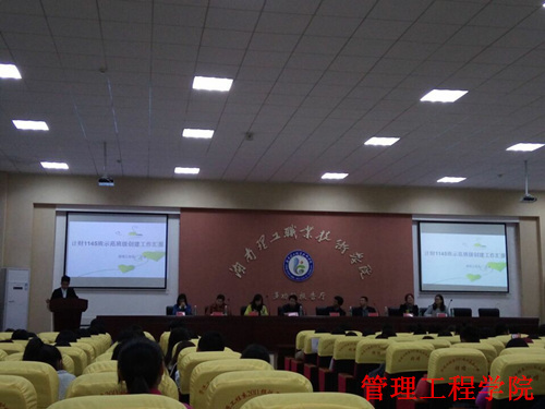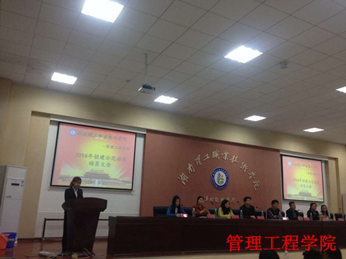 为促进管理工程学院的学风建设,增强求真务实,争先创优精神,3月28日晚上七点半在学校图书馆报告厅举办了2016年创建示范班级动员大会。到场的嘉宾有管理工程学院党总支书记、院长谭境佳,党总支副书记、副院长欧又瑞,副院长夏红雨,会计专业带头人李姝娟,管理专业带头人周星岚,市场营销专业带头人黄慧化,酒店管理专业带头人丁琪,以及辅导员团队和班主任老师们。大会由团总支书记李婷主持。