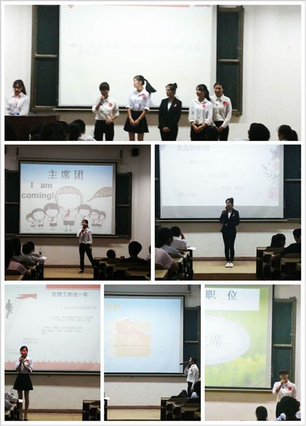 服务不息,成长不止!大会一开始主持人就直接进入主题,把舞台交给竞争的每一位选手。主席团,以服务同学为中心,以协调沟通为途径,以内部建设作支撑,坚持继承与创新,坚持学习与反思,坚持竞争与互助。在此基础上各位同学通过ppt的展示和现场的演讲来阐述自身的优势以及竞选的职位。接下来,通过现问现答的方式来了解同学们的思维处事方式。当同学们还回味在选手精彩的演讲中大会已经接近的尾声。