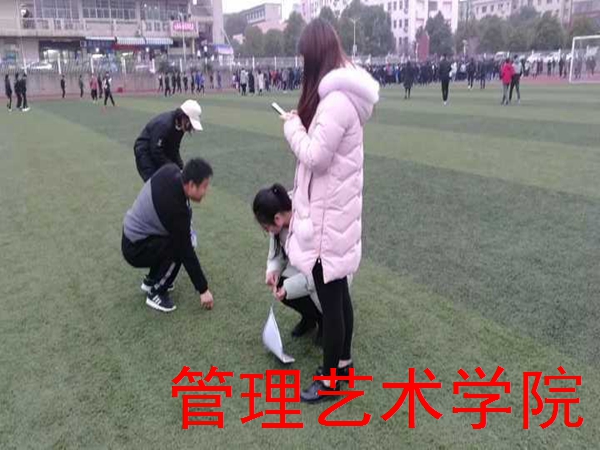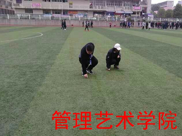 (管理艺术学院学生干部主动弯腰捡起操场上身边的垃圾)