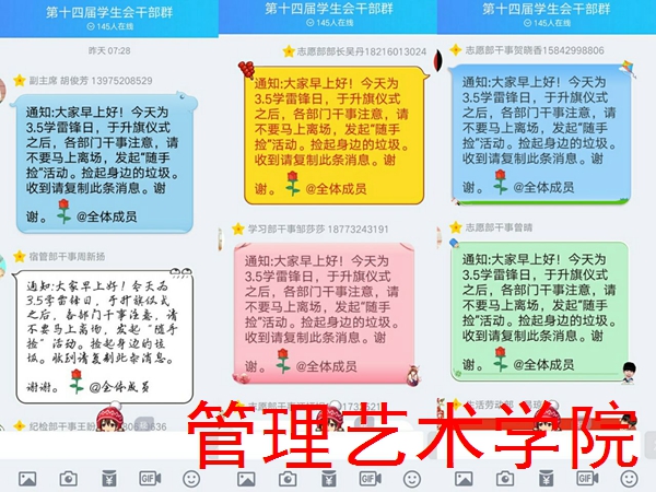 升旗仪式结束,管理艺术学院立即行动,再次重温雷锋事迹,学习雷锋精神,对在新时代履行新使命,以奋斗的新作为来创造美好的新生活。管理艺术学院志愿部发起“随手捡”志愿活动,我院学生干部主动捡起操场上身边的垃圾。