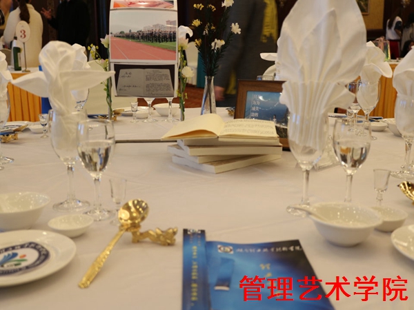 今年是湖南理工职业技术学院四十周年校庆,1号桌参赛选手以“大美理工”为主题设计的摆台,台面整个作品由蓝色和白色组成,中间摆着一个摩天轮,上面贴着理工的三个平台以及学校的校训,桌面用笔记本、书籍、相册等展示,蕴意着学校的四个一工程(每周一书、每人一语、每课一讲、每日一记),桌上的筷套印刷着《理工九条》,等等触动人心的细节设计,凸显出学校的读书之美、育人之美,明事理之美,立德立技之美。其他选手们独具匠心的心思也让嘉宾和评委驻足称赞。