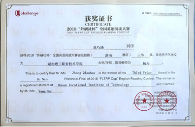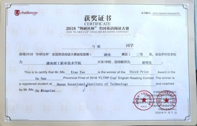 On November 3, 2018, Hunan Provincial Final of 2018 “FLTRP Cup” English Reading Contest was held in Central South University of Forestry and Technology. Through the teachers’ recommendation and the instructor group’s selection, two students from our school, Zhang Qiaohan and Xiao Yao, participated in the contest. Eventually, both of them won the Third-Prize award in the fierce competition with nearly 200 students selected from 71colleges and universities in the province.