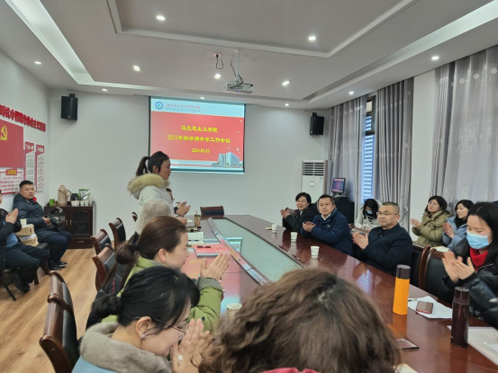李科校长强调:马克思主义学院作为学校高质量发展的重要组成,承担着提高学校整体实力,提升学生综合素质的重要角色,对学生职业生涯规划发挥着不可替代作用,为学校实现“四一两全”战略目标发挥着重要功能。希望马克思主义学院这支年轻的队伍,继续保持昂扬的工作作风,2024年继续发力,贡献力量。一是进一步践行“一人一年一成果”,希望学院每一位老师根据实际制定发展目标,在精品开放课程、教学能力竞赛、省级教学成果、科研课题、高质量论文、科研社会服务等方面有新的突破;二是进一步深化教学改革,抓住教学这根生命线,不断提高教学质量;三是坚持问题导向,抓住平台和契机,推动教育教学成果转化为高质量发展动能,助力学校“四一两全”战略目标的实现。