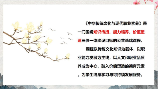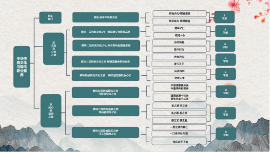 二、课程内容:课程贯穿爱国处世与修身教育、中国传统文化智慧与精粹,并基于高职学生核心职业能力的需求,将内容重构为品文化修立身之德,赏匠心修傍身之技两大模块、7个教学专题、28个教学任务,共40学时。