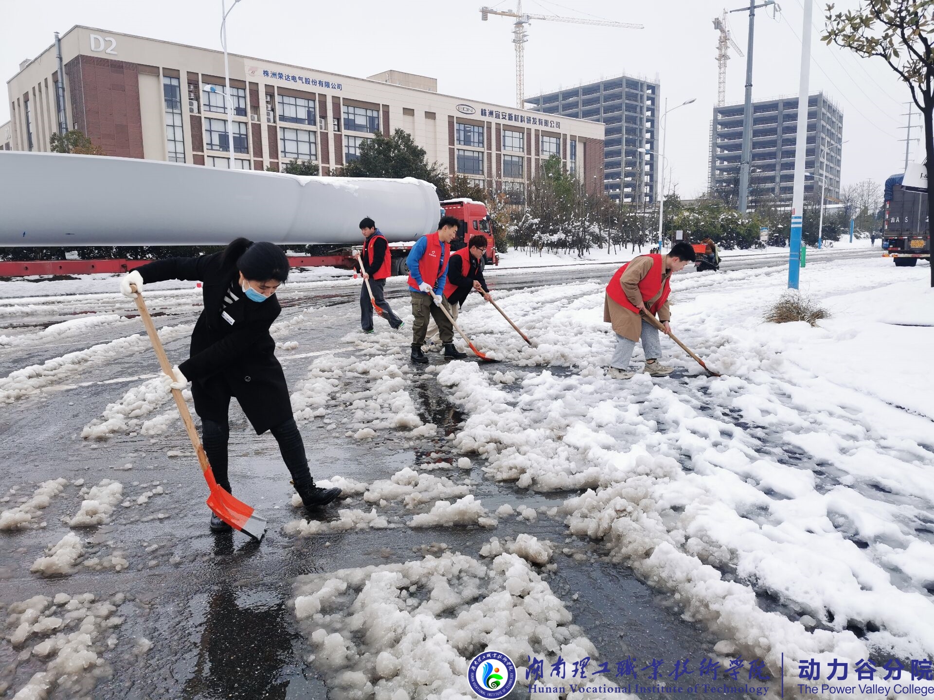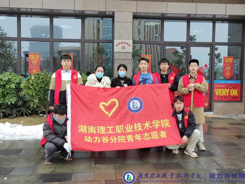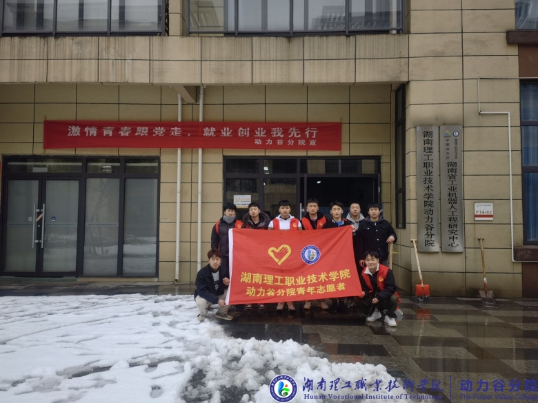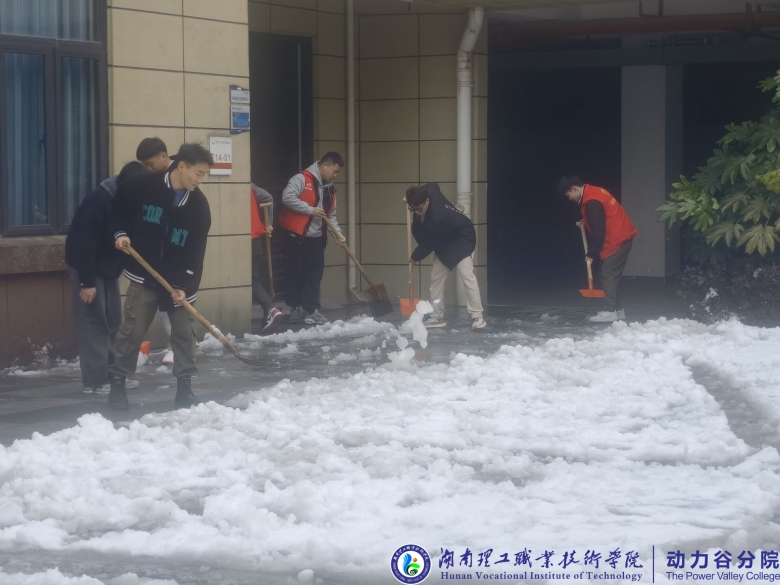 天降瑞雪,2022年第一次漫天的雪花为动力谷园区增添了独特的韵味和别样的风景,在给大家带来欢乐的同时,也给出行带来了许多不便利,园区内遍地积雪,严重影响了园区工作人员和动力谷分院学院学生的出行。为防止积雪结冰造成安全事故,2月23日上午9点,湖南理工职业技术学院动力谷分院志愿者团队与动力谷园区一站式服务中心工作人员积极开展了清扫积雪活动。