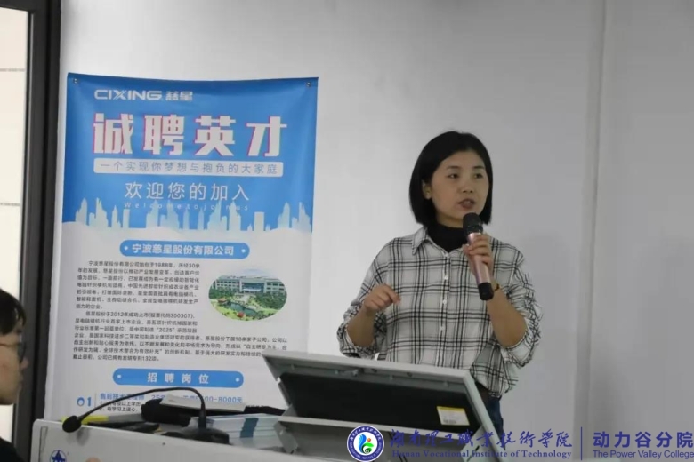 宁波慈星公司人力资源部经理李丽红向在场同学放映公司宣传片,展示企业发展历程。随后,就企业的行业地位、企业文化、规章制度、福利待遇、现有产业结构、组织构架等做了详细介绍,“敬业、诚信、创新、和谐”的企业精神深入人心。