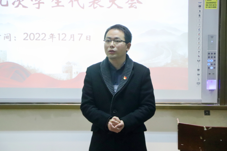 李强致开幕词,他对大会的召开表示热烈的祝贺,也对学院第十八届团总支学生会的工作给予充分的肯定,并指出,在全校上下深入学习贯彻党的二十大精神之际,本次学生代表大会的召开恰逢其时,并对同学们提出了三点希望和要求:一是希望各位学生代表要坚定理想信念,坚定不移地跟随党和国家的脚步,以党的二十大精神为指引,为实现中国式现代化增添青春正能量。二是希望各位学生代表坚持原则,严于律己,起带头表率作用,以便更好地开展相关工作。三是希望各位学生代表勇于担当,善于创新,在学习、工作实践中不断增长本领,取得更好成绩。
