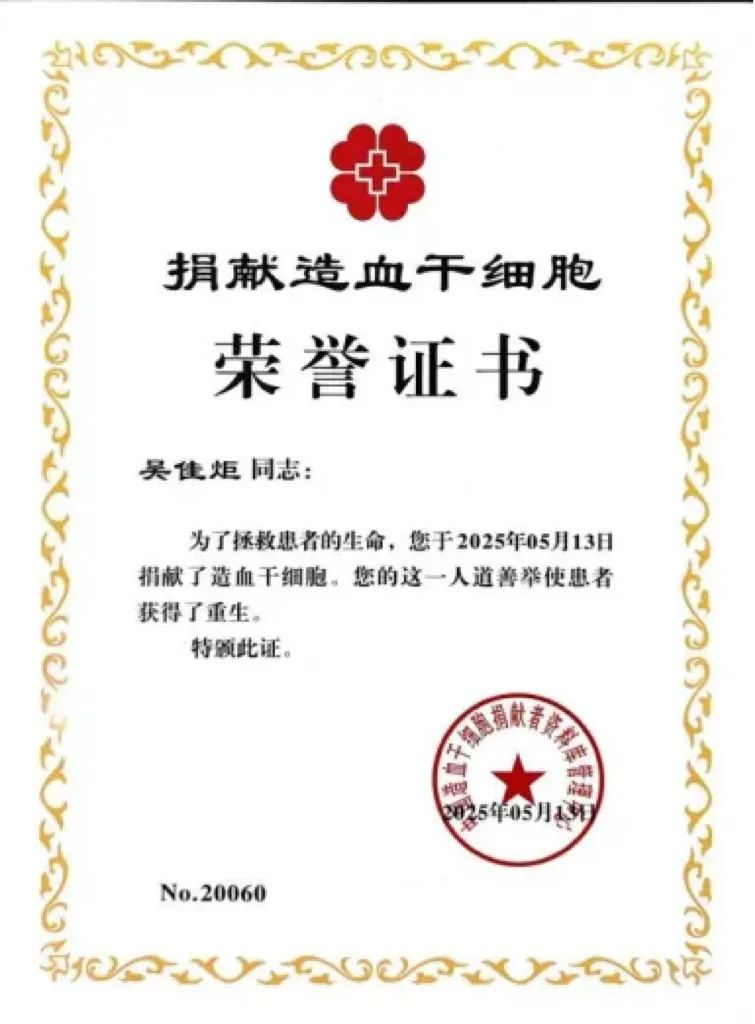 2025年4月,一通来自湖南省红十字会的电话让吴佳炬热血沸腾:“您与一名地中海贫血患儿初配成功,是否愿意进一步检测?”“当然愿意!”他的回答没有丝毫犹豫。随后的高分辨配型和健康体检中,他像对待专业课考试般认真:推掉周末聚会、坚持规律作息、每天研读捐献科普手册。“想到电话那头是个需要依靠干细胞才能活下去的孩子,我必须用最佳状态迎接这场‘生命考试’。”