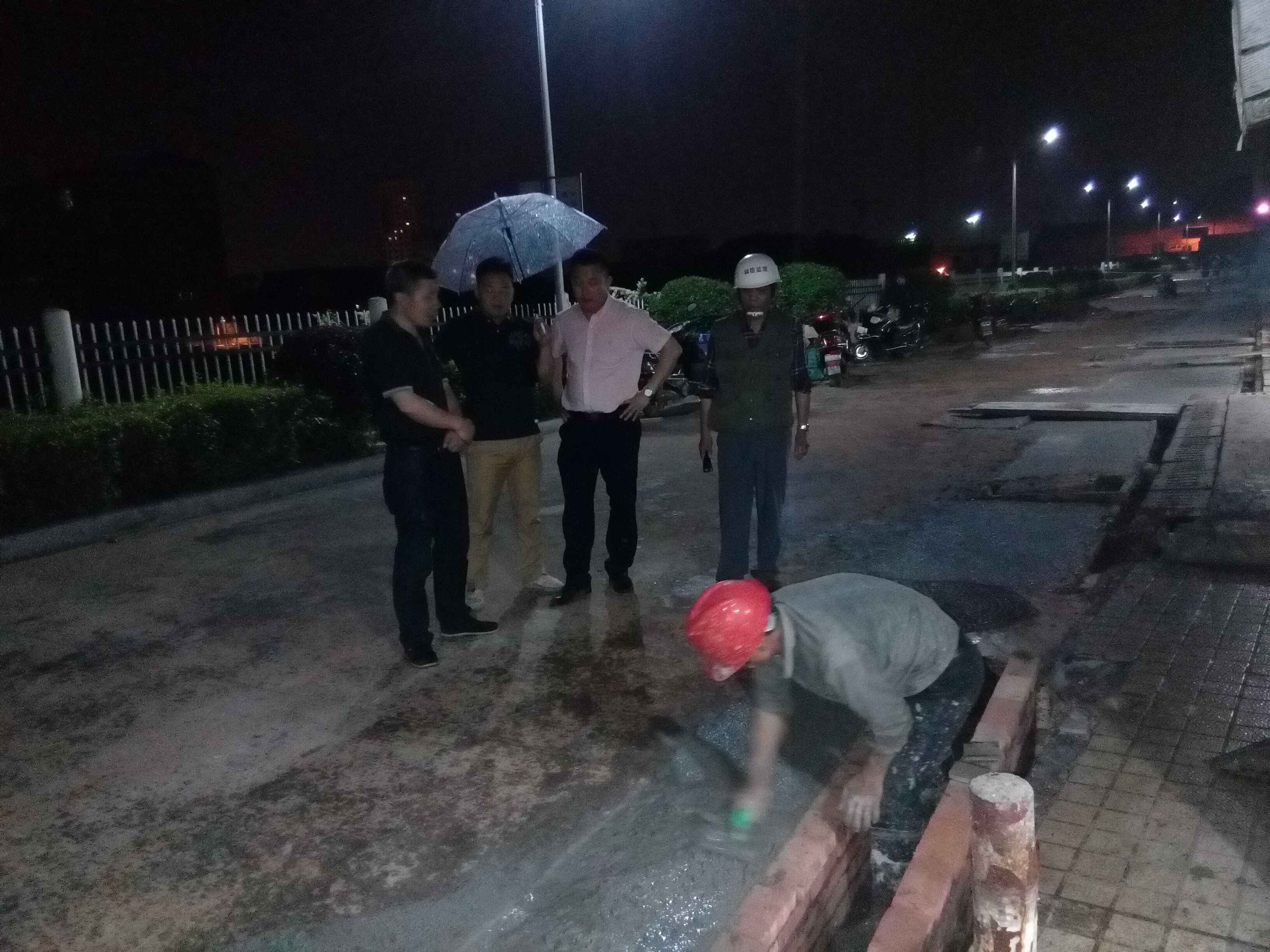 后勤产业处负责人田野、副处长邓博文在雨夜深入工地检查施工质量