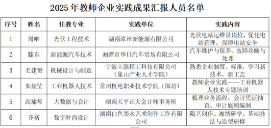 在成果展示环节,周唯等六位教师结合暑期在新能源技术、智能制造产业、现代服务业等领域企业的实践经历,依次作了兼具“产业温度”与“教学价值”的分享。各位教师深入企业生产一线,近距离接触行业内的新知识、新技术、新工艺、新材料、新设备、新标准等,深度参与企业实际项目,收集了大量企业真实工作案例。这些实践成果不仅丰富了教师的教学素材,让课堂教学更贴近行业实际,更为学校人才培养方案调整、专业课程内容更新、实习实训项目设计提供了重要的参考依据,实现了“实践反哺教学”的良性循环。