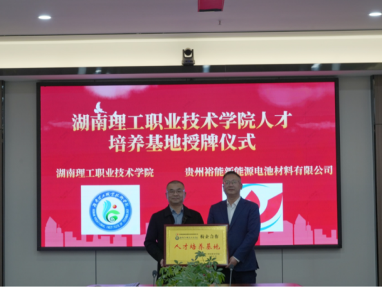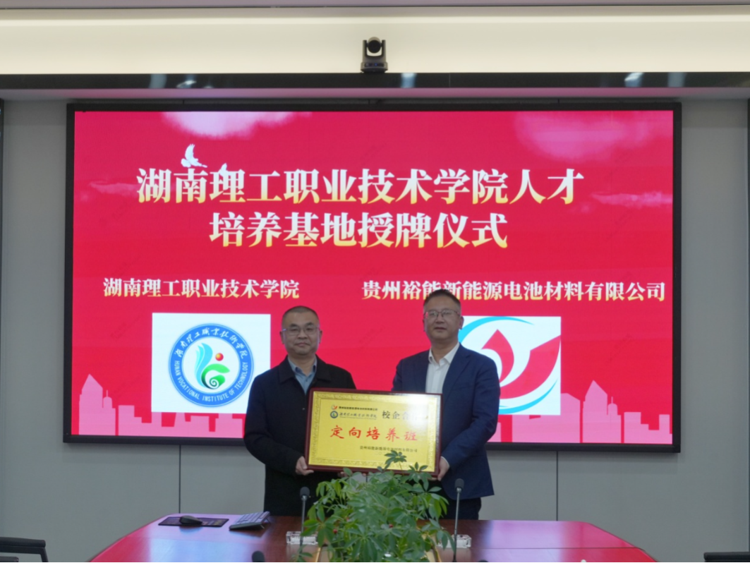 李科表示,贵州裕能是一家实力强劲、发展迅速的新能源电池材料企业,感谢企业选择与学校合作,此次合作不仅是企业对学校办学理念与人才培养质量的认可,更搭建起校企协同育人的新桥梁,这一桥梁将为学生打通从校园走向职场的优质过渡通道,为学校推动毕业生实现更高质量就业筑牢坚实基础。会后,李科代表学校向贵州裕能授予“人才培养基地”牌匾,贵州裕能向学校授予“定向培养班”牌匾,正式开启了校企联合培养模式。