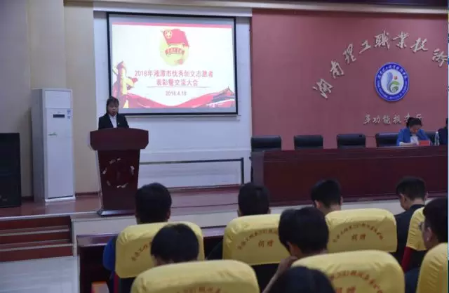 4月18日晚,由校团委主办,校学生会青年志愿者服务中心承办的2018年湘潭市创文优秀青年志愿者表彰暨交流大会在博学楼多功能报告厅顺利举行。校团委副书记李强,校团委李丽莎老师、智能制造学院团总支书记吴雅婷、管理艺术学院团总支书记李婷出席。大会由邓志翔同学主持。