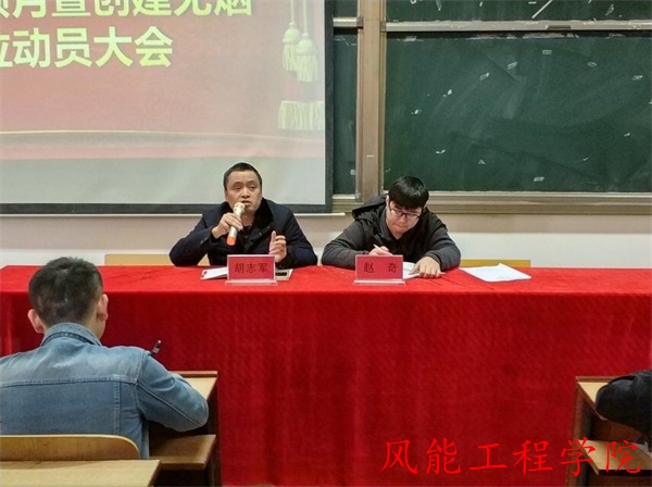 11月21日中午,风能工程学院在明理楼南栋110教室召开“纪律月暨创建无烟单位”动员大会。出席会议的领导有风能工程学院副院长胡志军老师。在校学生党员、学生会各部门代表、16/17级各班级班委参加会议,会议由辅导员赵奇老师主持。
