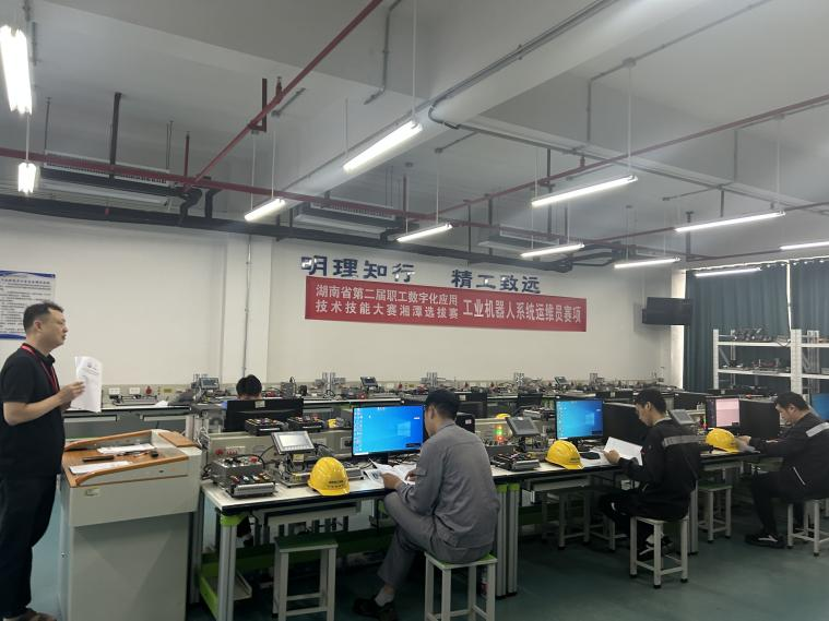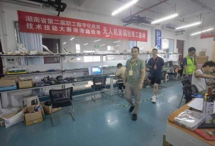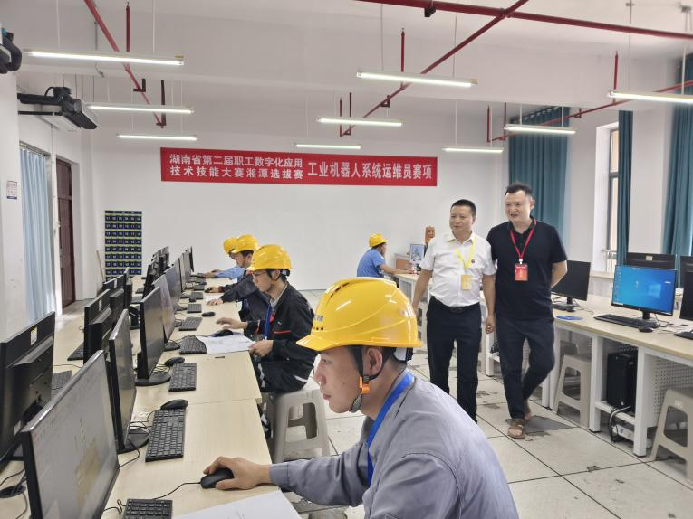 9月14日,湖南省第二届职工数字化应用技术技能大赛湘潭选拔赛(工业机器人系统运维员赛项、无人机装调检修工赛项、数据安全管理员赛项)三个赛项在湖南理工职业技术学院省级公共实训基地(湖南省“湖湘工匠”培训基地)举行,本次赛项任务主要由湖南理工职业技术学院智能制造学院承办,学校工会、教务处、学工保卫部、后勤处协办;湘潭市人力资源与社会保障局技能鉴定中心主任潘浩、副主任王华诚、湘潭市总工会调研员邹谦、湘潭市总工会劳动经济部部长赵正凯等来现场指导,主要负责选拔湘潭市最优秀的职工选手代表湘潭市参加湖南省第二届职工数字化应用技术技能大赛。